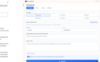 KromeAssist es una extensión gratuita para Chrome que transforma la manera de interactuar con el contenido en línea. Utilizando modelos de OpenAI, permite generar respuestas, resúmenes, traducciones y más, todo con un solo clic. Sus seis potentes acciones incluyen la generación de respuestas contextualizadas, resúmenes claros, simplificación de temas complejos, elaboración de ideas y análisis de información, lo que lo convierte en una herramienta versátil para creadores de contenido, estudiantes y profesionales.